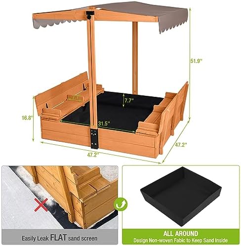 Kids Wooden Outdoor Sandbox w/Canopy, 2 Foldable Bench Seats, Retractable Roof Sand Protection Liner 47×47-Inch