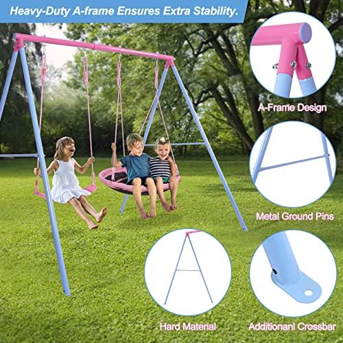 Swing Set, 440lbs, Heavy-Duty A-Frame Metal Outdoor Swing Stand, 1 Saucer & 1 Belt Swing seat for Playground, Backyard Pink